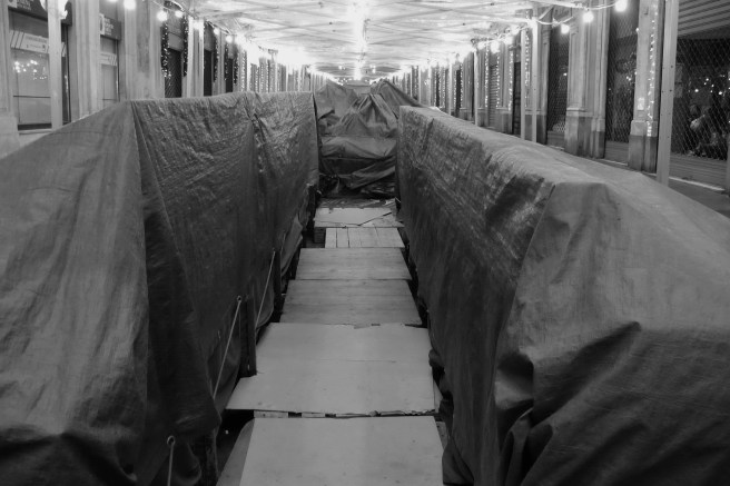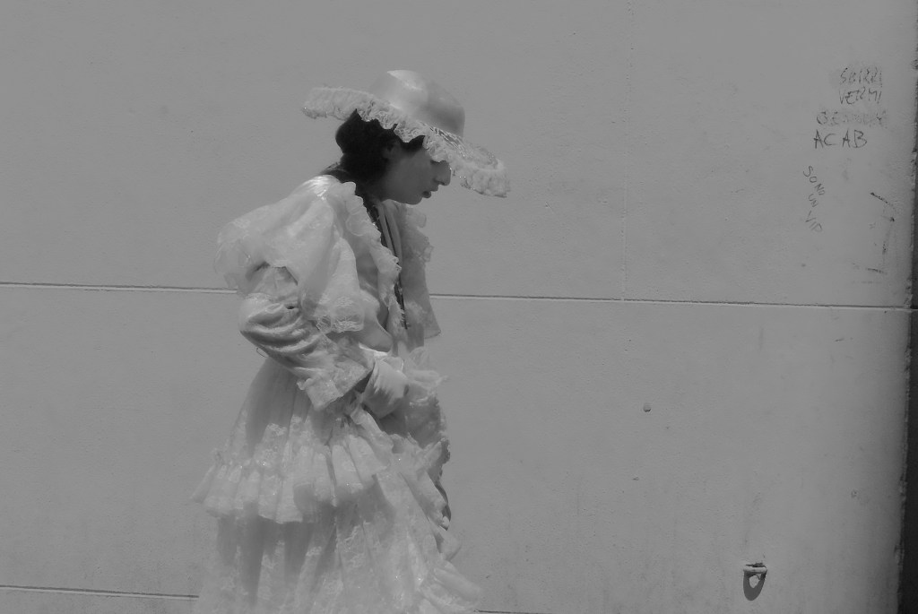 Devo osservare il mio gruppo che si è mischiato al corteo per non perderli di vista. Allungo il passo e affianco la processione e alzo e agito il mio ombrello bianco in cima al quale ho annodato un fiocco rosso sfarzoso. So dove sosterà la processione, è uno dei luoghi più consumati dalle visite, dai percorsi turistici, dal passaggio, dallo scarico merci, il luogo dove l’aria – sabato e domenica – è benedetta dalle bombolette spray.