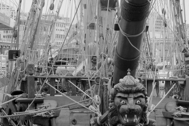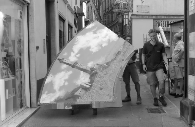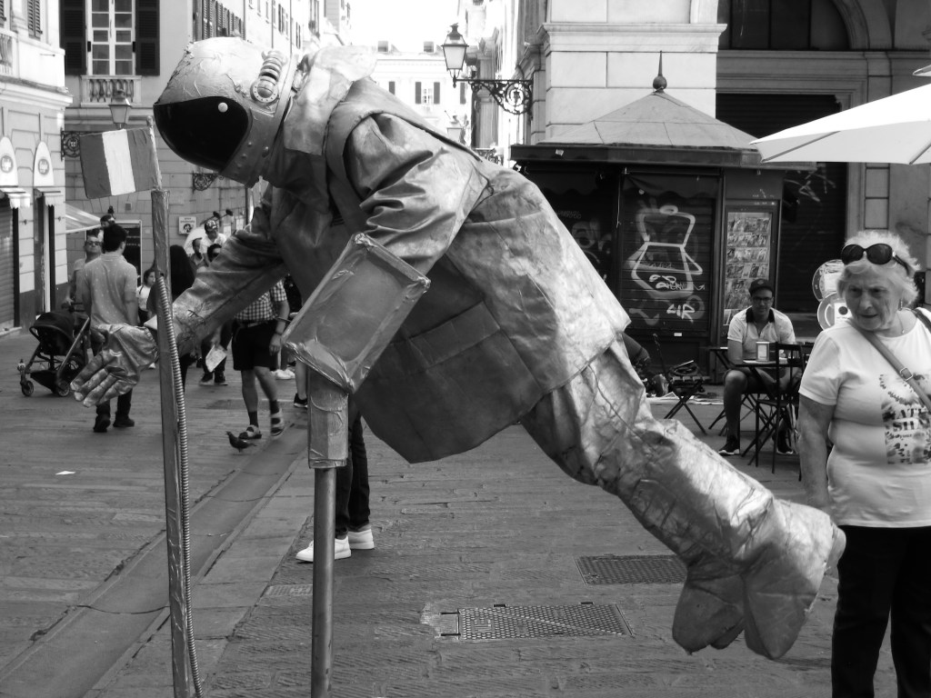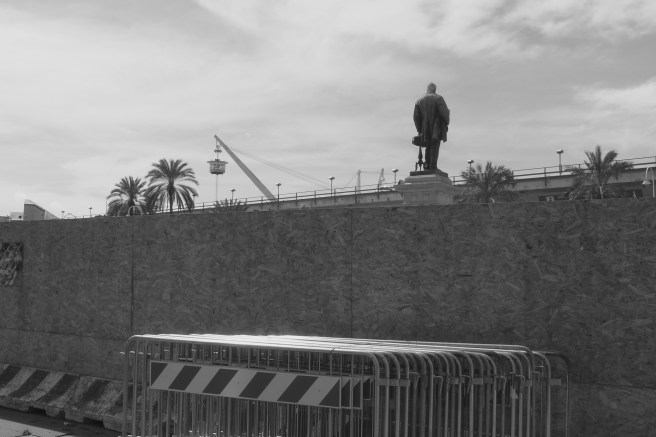 Ogni tanto incontro altre guide, certe le conosco, altre no. Sono molte, e di anno in anno il numero aumenta. Facciamo tutte gli stessi giri, diciamo le stesse cose, facciamo il compito per le agenzie così come lo impongono i diversi pacchetti. Siamo tutti professionisti, professionali, educati, attenti, rispettosi, tolleranti, tutti – a denti stretti. A denti stretti teniamo in gola, tutti, quello che vorremmo dire, quello che pensiamo su turismo e turisti, sulla città, sui padroni della città per i quali non siamo in pochi a lavorare. Ad esempio vorremmo dire che la bolla di plastica è sconcia, fa urlare uccelli tropicali, e che sbatti sempre il mostro in prima pagina su cartelloni giganteschi è disgustoso, come le sequenze di gabbie di vetro, sedie e tavolini neri, tutti uguali, come le panchine disposte a corridoio, l’orizzonte a ponente senza aria e senza luce, le innumerevoli ringhiere, cancellate, transenne, sbarramenti, delimitazioni, reti, divieti, restrizioni. E che spesso l’aria del porto puzza di smog. Il porto antico… e le sue statue o steli, una dedicata a ***, l’altra a ***, una sotto vetro, una scomparsa. Come le panchine della darsena: schiodate, spostate, usate come dormitorio o circolo, panchine circolari disposte a cerchio, appropriazione di uno spazio pubblico non difeso, e alla fine rimosso.