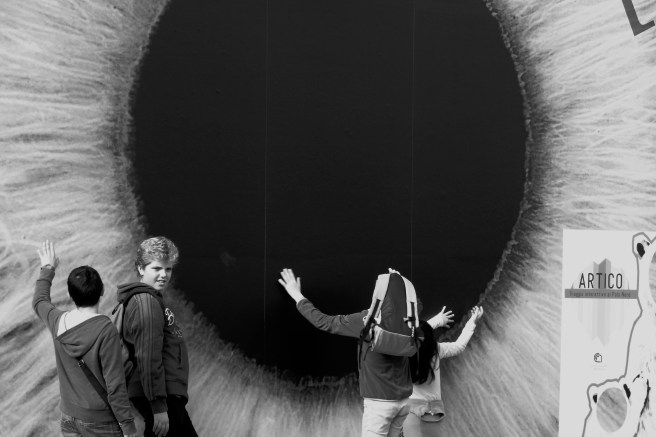 “Più avanti. No, più indietro. Sì, sopra le lettere. Arrampicatevi. Così. Passami la bacchetta, annoda il nastro, assicuralo bene. Ieri è volato via, senza il nastro gli ultimi non mi vedevano, qualcuno si è perso. Uno l’ho ritrovato dentro un getto d’acqua, un altro contrattava per comprare dei fossili falsi.”