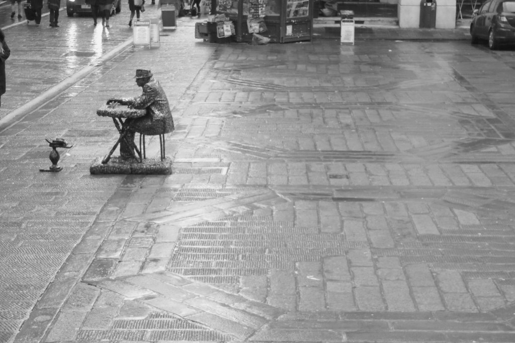 Mi ritrovo a fotografare angoli e palazzi ripresi tante volte, persone, insegne, la solita statua, oggi con una luce impastata, uniforme. Nessuna ombra portata. Perché in un passaggio stretto uno mi vede, mi squadra e torna indietro? Non subito. Ha indugiato ruotando per tre quarti su sé stesso poi, come avesse ricevuto un comando, è tornato indietro. Le pareti del breve passaggio sono gialle. Verso sud si vede l’arcata che ride di Palazzo S.***, ponteggi, cavi penzolanti, poca gente dato il caldo umido. C’è, come tutti i giorni, un uomo piccolo, grasso, dalla faccia gialla, sempre col sigaro in bocca. Il colore del viso è sgradevole come il modo di guardare, un modo padronale, come se lo spazio intorno fosse di sua proprietà. Il vento rinforza e i cappelli per turisti svolazzano, le corde di un’arpa vibrano da sole.