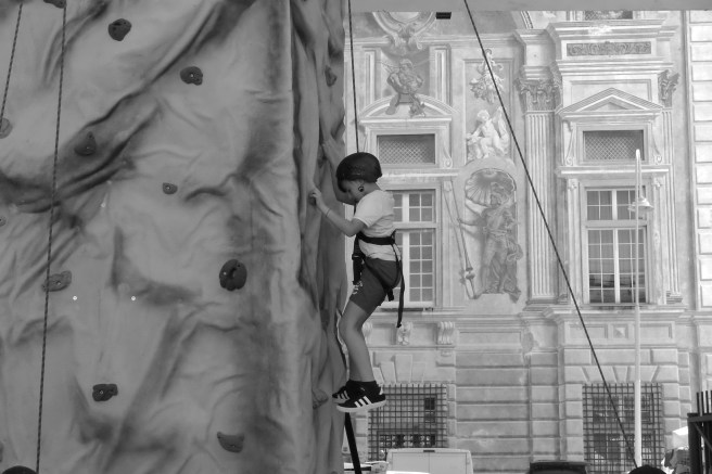 Qui si cammina su belle pietre sconnesse, fra palazzi altissimi appoggiati uno sull’altro, avvitati uno dentro l’altro. La materia più diffusa è il marmo; sovrabbondante nei palazzi e nelle chiese. Poi l’ardesia. La città sembra talvolta una fotografia in bianco e nero: ci sono chiese e palazzi a strisce bianche e scure, colonne bianche affiancano colonne nere. Tuttavia non è una città grigia: trionfano i trompe l’oeil dai colori accesi. Le figure di palazzo San *** squillano la fanfara del giallo, per esempio. E gli interni sono una foresta di grottesche, sfondi blu cobalto, fiori, piante, animali dai colori saturi, come diapositive polarizzate e intorno – scale, colonne, balaustre, gradini, capitelli, pavimenti, statue – il marmo onnipresente, smagliante oppure opaco o policromo, come nei bellissimi intarsi della cattedrale.